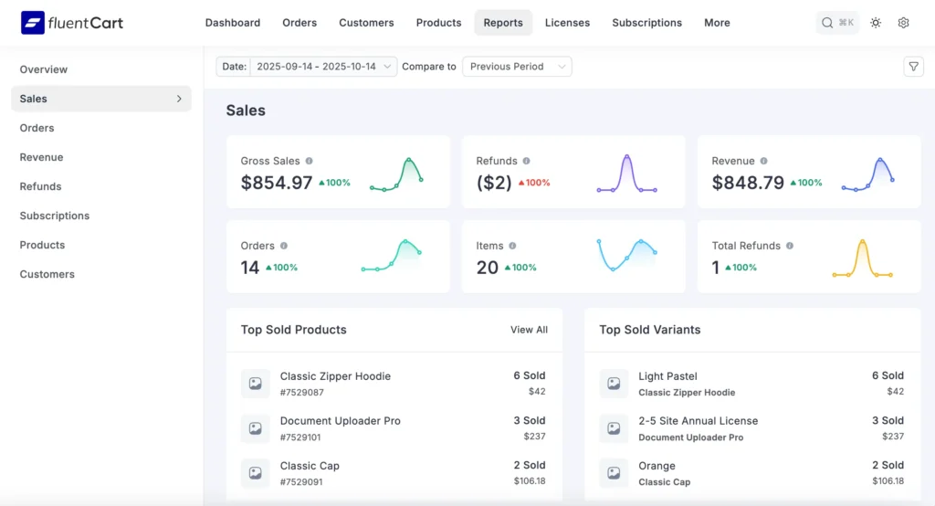 FluentCart comes with powerful built-in analytics that give you a clear picture of your sales, customer activity, and overall store performance.