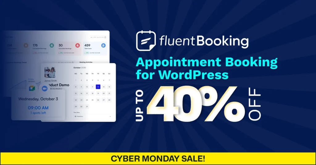 Enjoy this Cyber Monday season with up to 40% off the best appointment calendar plugin for WordPress and make booking hassle-free. Grab FluentBooking today and join 10K+ happy businesses. Don’t miss this sweet deal. It’s only here for a short time!