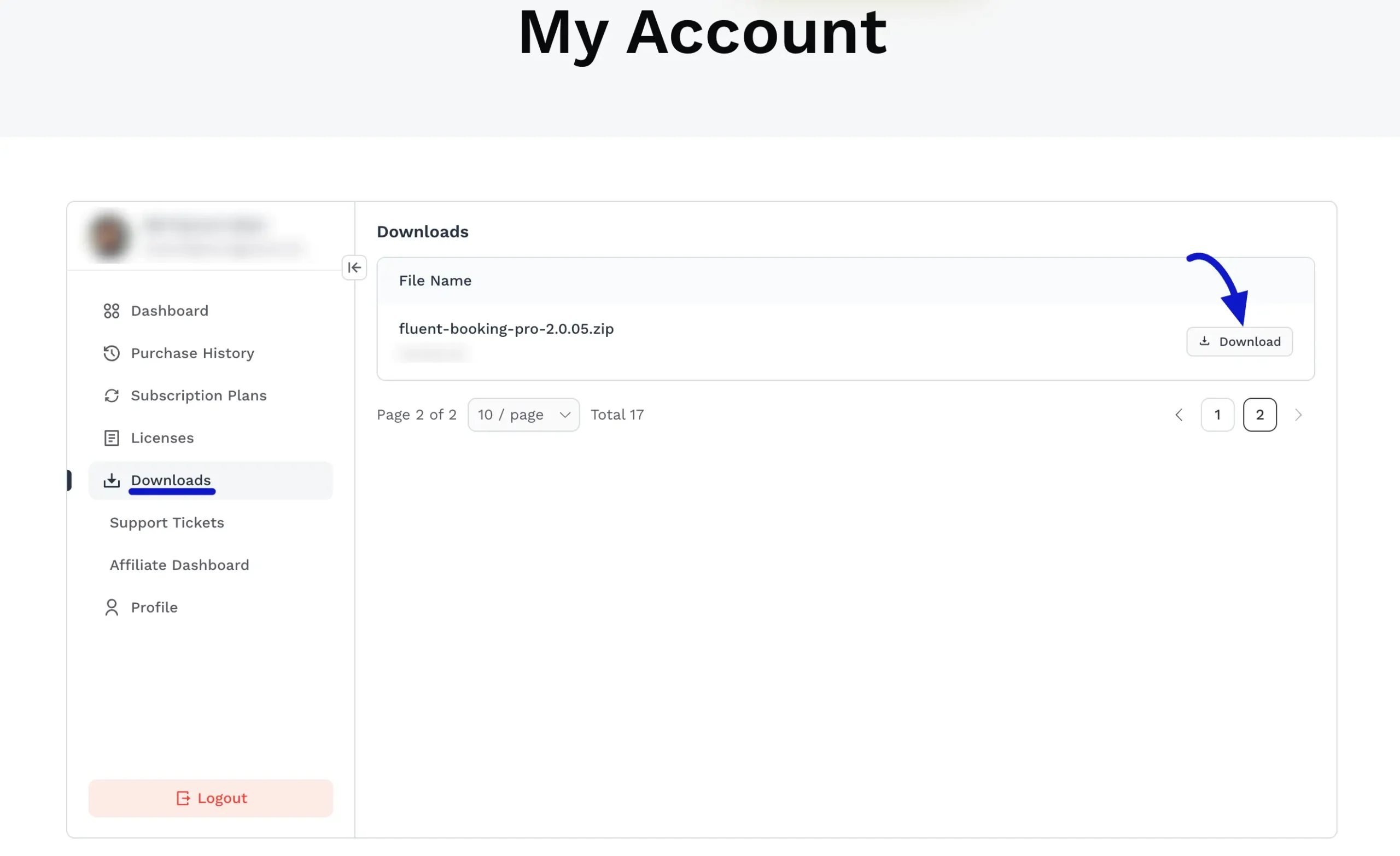 - Click the Download button on the right side of the row. The FluentBooking Pro plugin will be downloaded to your device in .zip format.