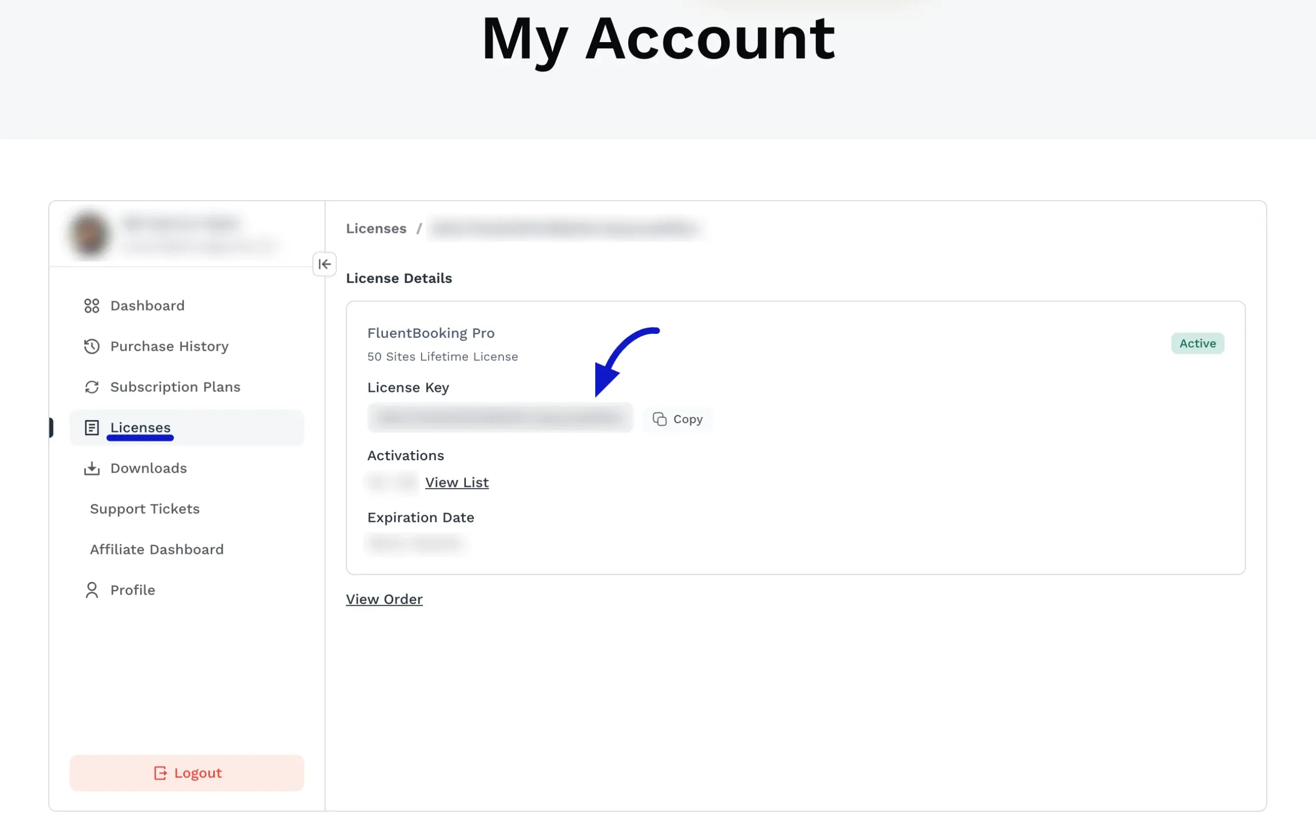 - Click the Copy button next to your License Key to copy it.