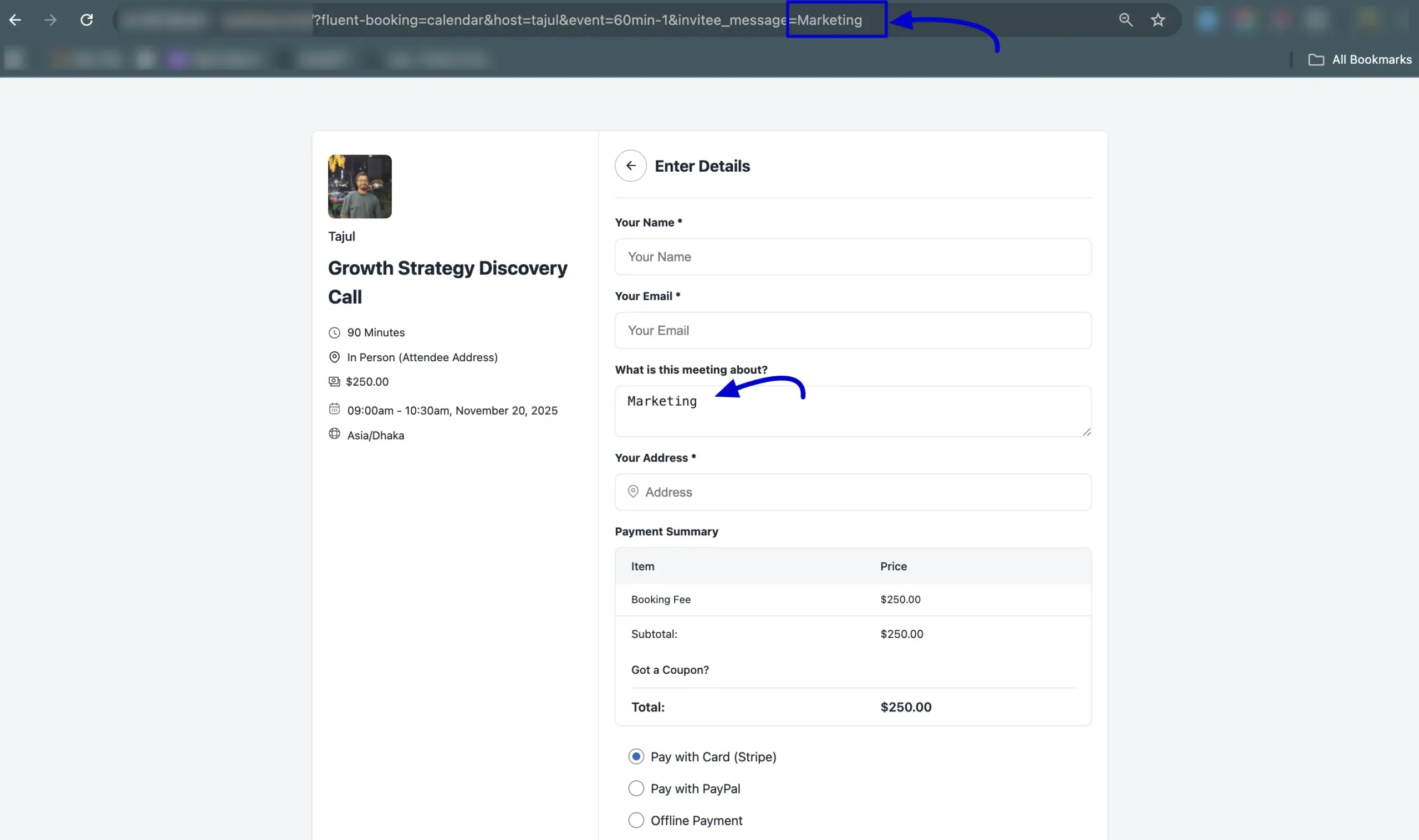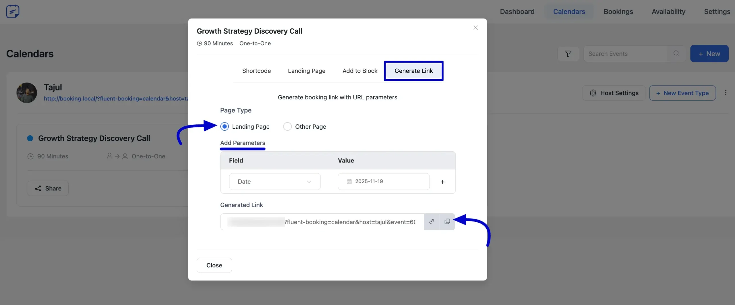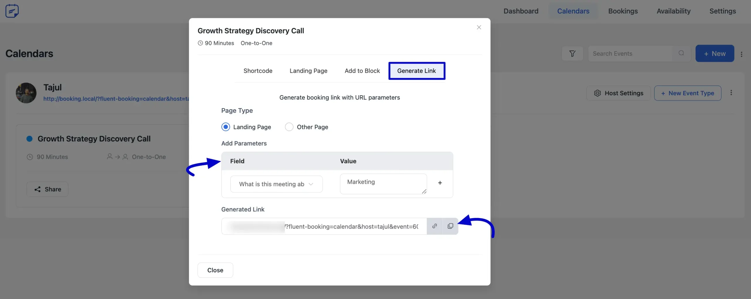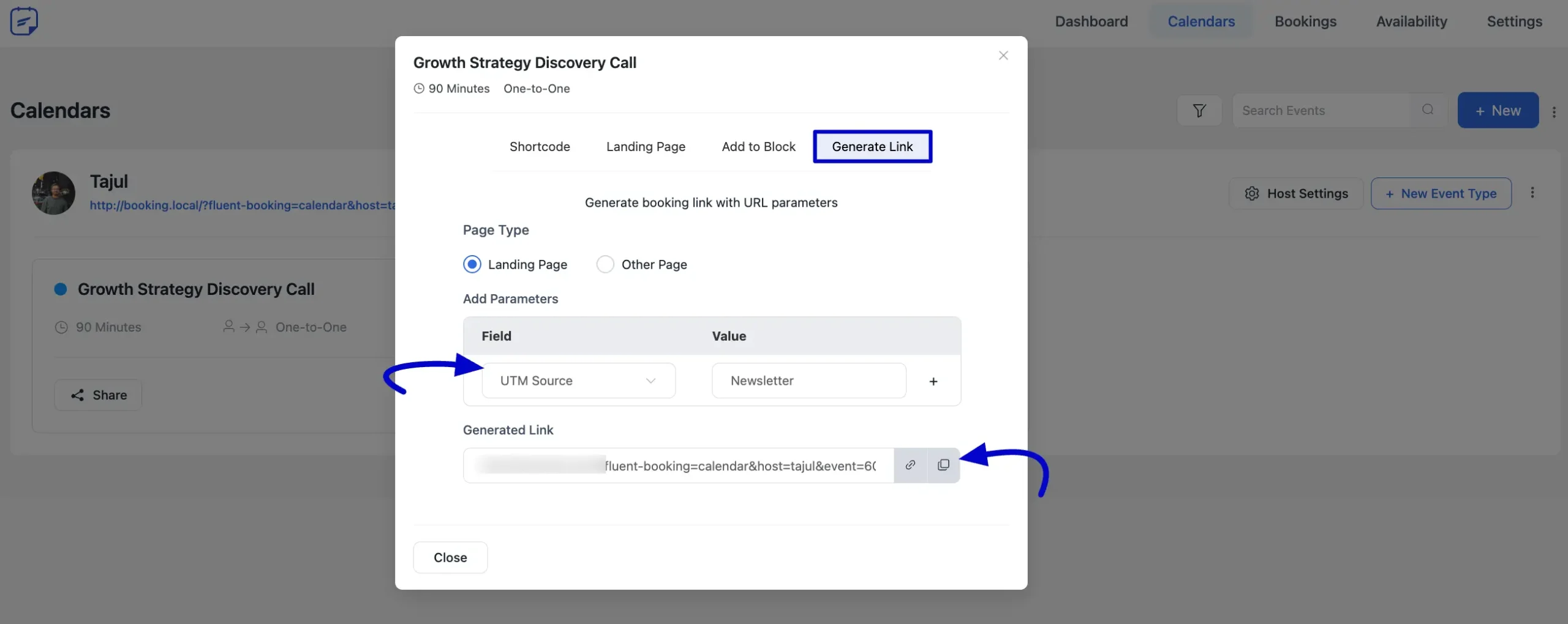 The easiest way to create these URLs is by using the built-in Generate Link feature in your FluentBooking dashboard.