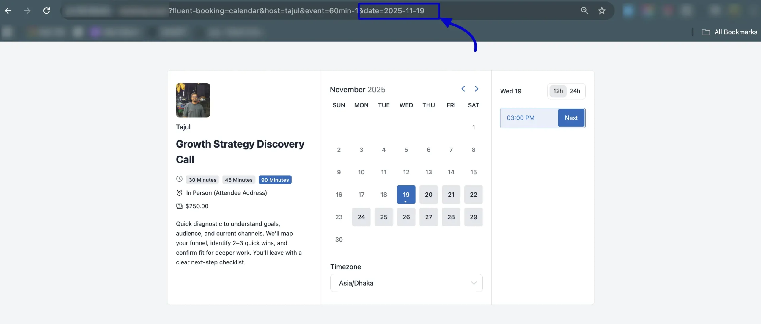 How it works for the user: When a visitor clicks this link, the booking form will automatically load with the fields you configured already filled in. For example, if you mapped a specific date, that date will be pre-selected on the calendar when the page loads.