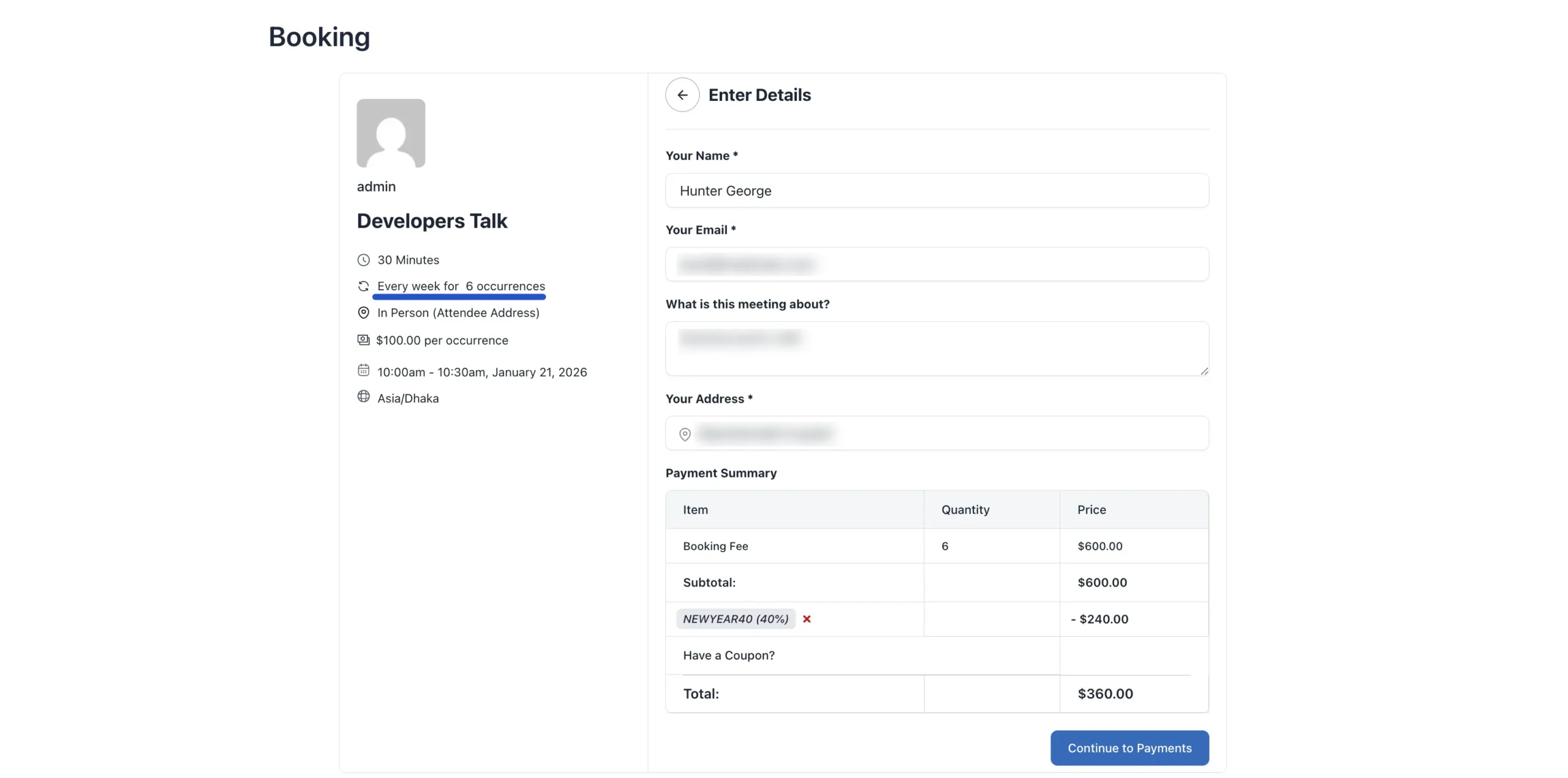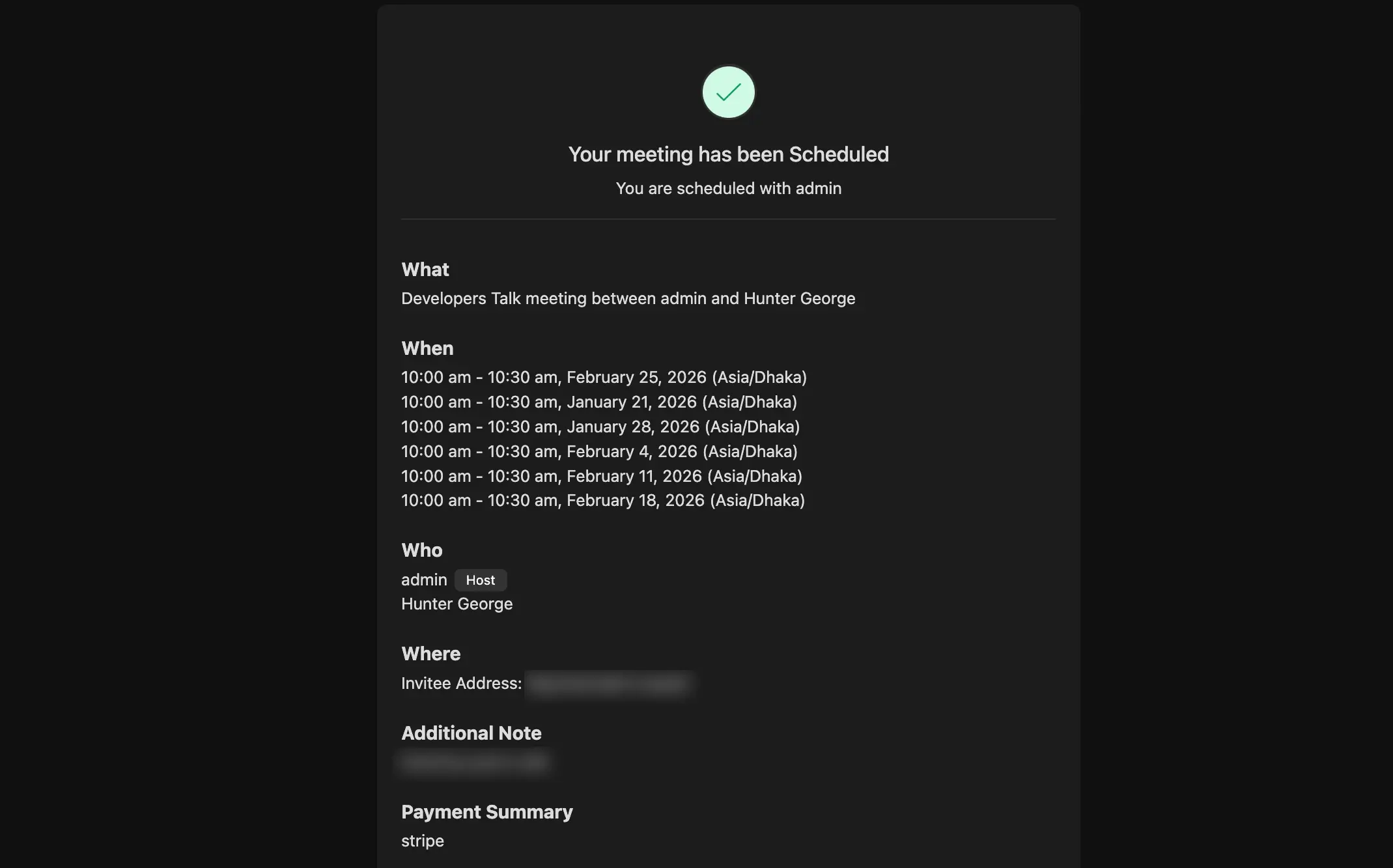 After they pay or confirm, they won’t just see one date. They will see a list of every single appointment date and time scheduled in the series, so they can add them to their personal calendar.